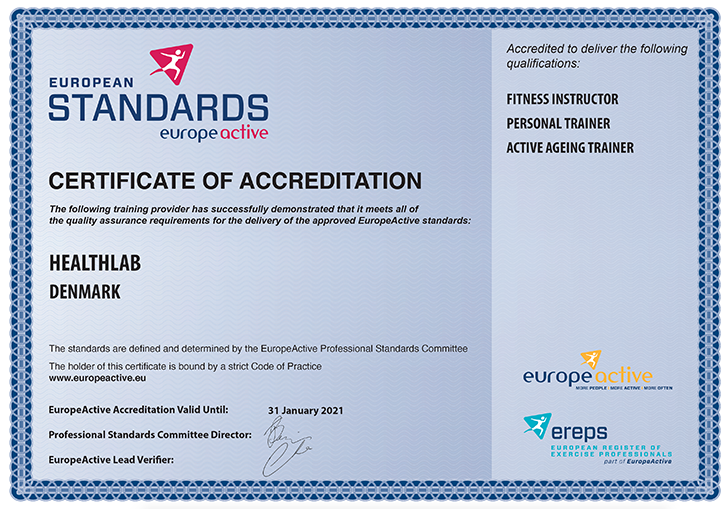 I anerkendelse af at der på europæisk niveau har været et behov for opgradering af kompetencerne og professionalismen i fitnessbranchen, har den europæiske brancheorganisation for fitnessbranchen (EuropeActive), via deres Professional Standards Committee oprettet kompetencestandarder for de meste almindelige erhvervsfunktioner i fitnessbranchen samt oprettet en mulighed for certificering og registrering.
